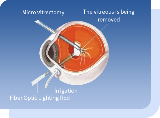 Pars plana vitrectomy (PPV) is a minimally invasive procedure done with special tools inserted through three incisions (less than 1mm) the pars plana, an area in the white of the eye (sclera), to remove vitreous humor and re-attach the retina by injecting expanding gas or silicon oil. Other treatments (when needed) will be done at the same time, such as laser, membrane peeling or injection of anti-VFGF etc..