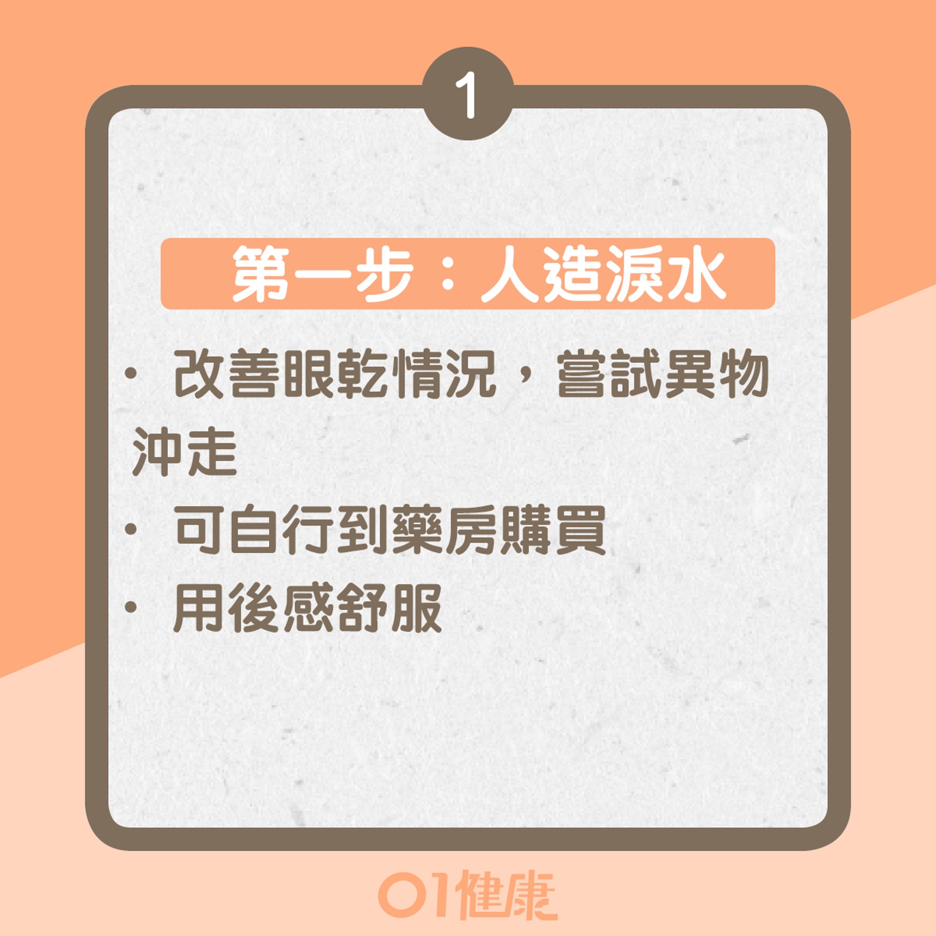 當患者眼敏感發作,感到眼乾時可使用人造淚水改善眼乾情況,嘗試將異物沖走。人造淚水可自行於藥房購物,一般人造淚水用後會感舒服。