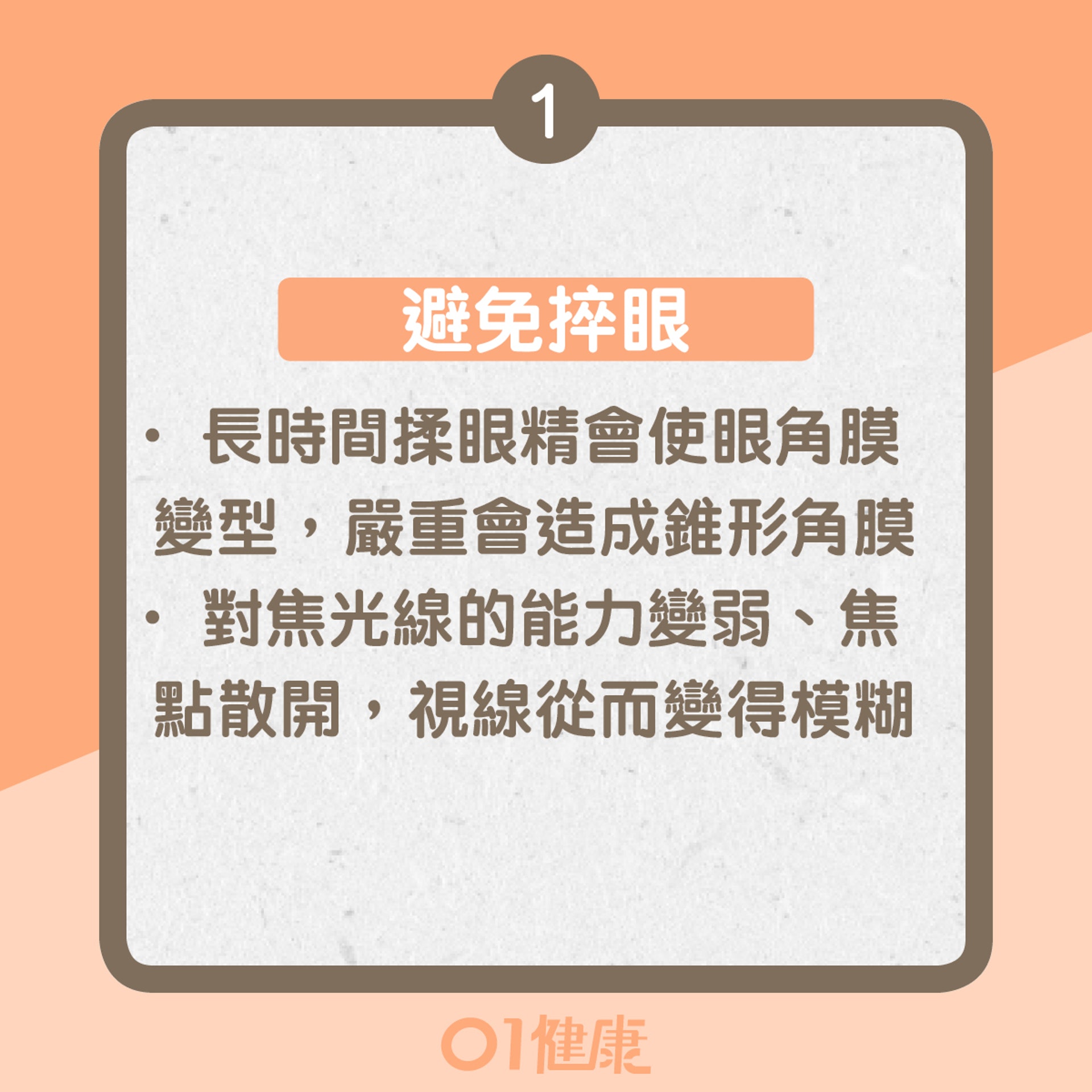 長時間揉眼精會使眼角膜變型,嚴重會造成錐形角膜。眼角膜本應是一個圓滑的球面,當變成錐形角膜,會像一座山突出,對焦光線的能力變弱、焦點散開,視線從而變得模糊。