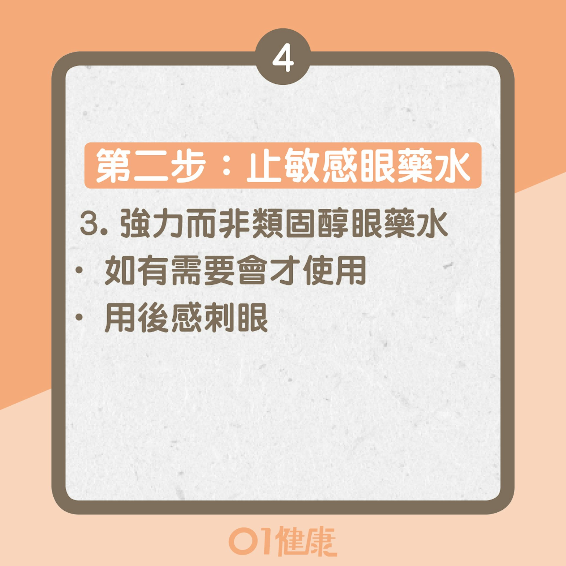 藥物方面,醫生會因應病人的情況建議合適的藥物,部分眼藥水可自行購買,部分為處方藥物(需經醫生處方)。邱醫生根據敏感程度,大概將服藥劃分為三步曲。
