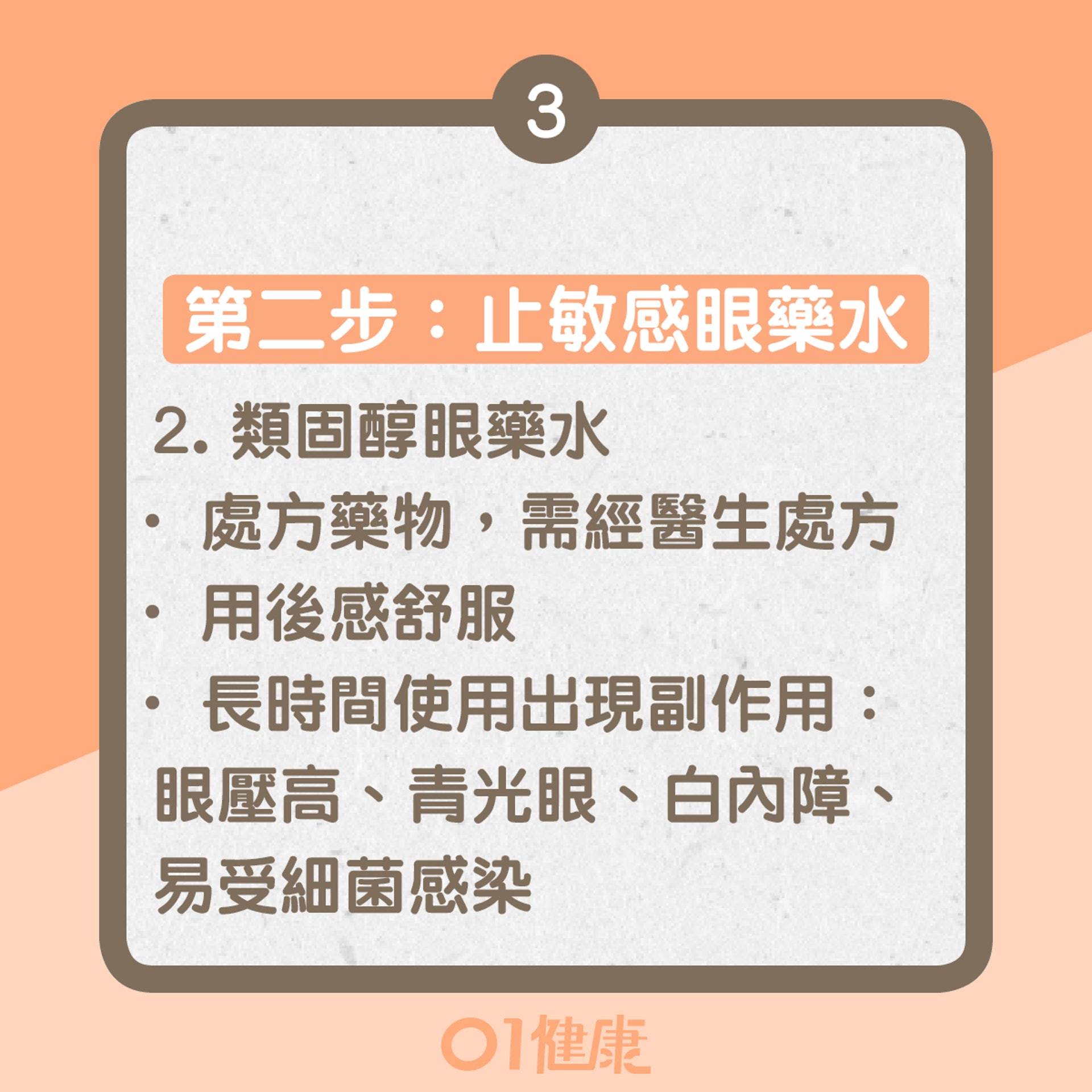 此乃處方藥物,一般需經醫生處方。雖然類固醇眼藥水用後會有舒服感,但長時間使用會出現副作用,包括眼壓高、青光眼、白內障和易受細菌感染,因此不建議長時間使用。