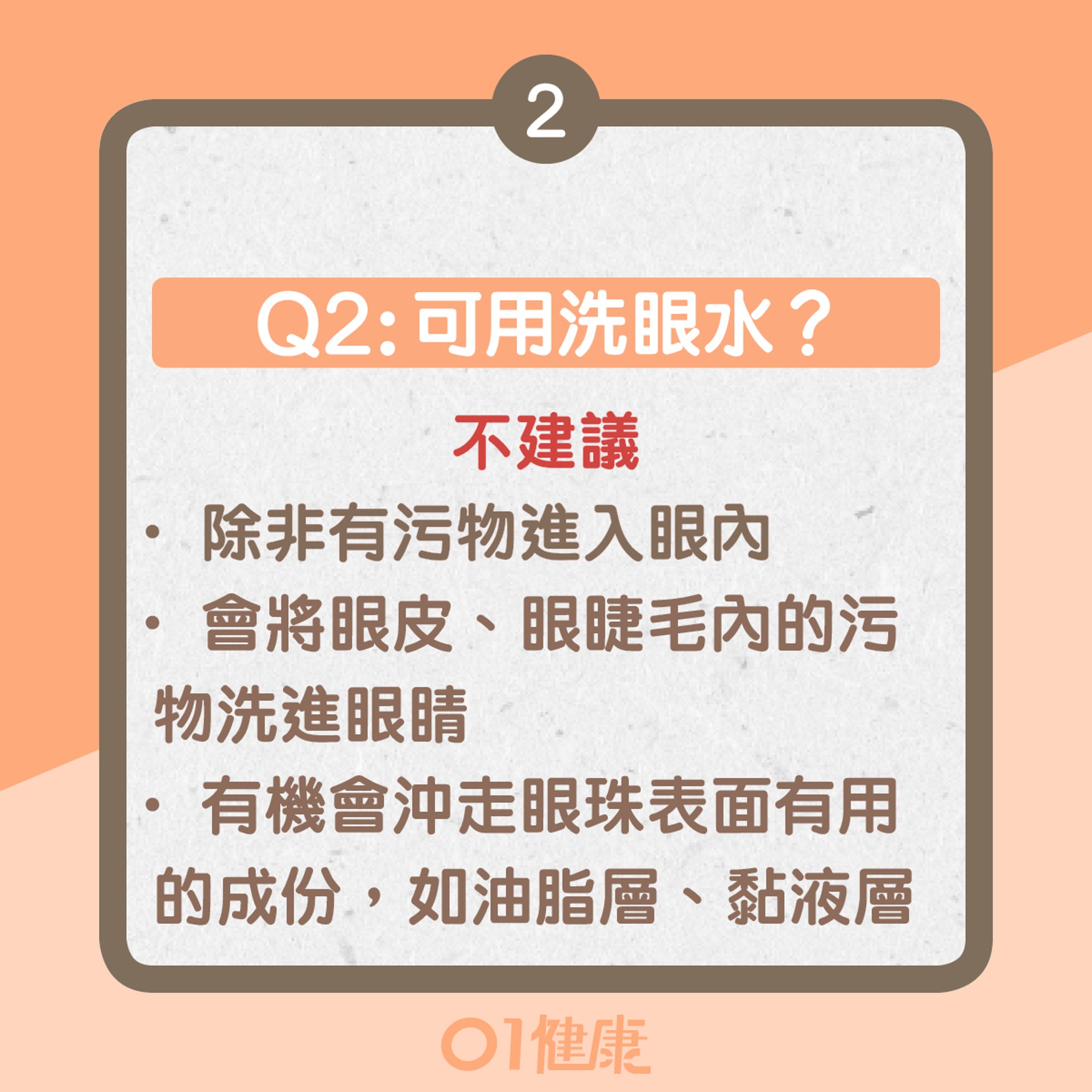 除了有異物進入眼內,否則一般情況不建議使用洗眼水,因為洗眼水會將眼皮、眼睫毛內的污物洗進眼睛。加上,使用洗眼水或會沖走眼珠表面有用的成份,如油脂層、黏液層。縱然使用後短時間內得到改善,但長久以下反而會加劇眼敏感情況。