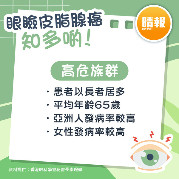 香港眼科學會秘書長李琬微醫生曾表示,皮脂腺癌病人由發病至確診時間平均約一年,而患者以長者居多,平均年齡65歲。她說,此癌症成因未明,但臨床證據顯示,長者、皮脂腺有非癌性腫塊、曾暴露於輻射,如曾接受電療或曾患其他癌症人士,風險較高;亞洲人發病率比白人高,本港發病率為11.1%,而女性與男性的患病比率為7比3。