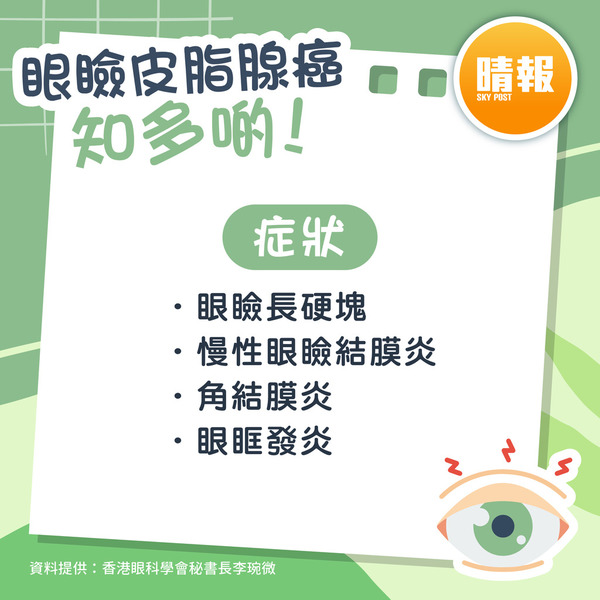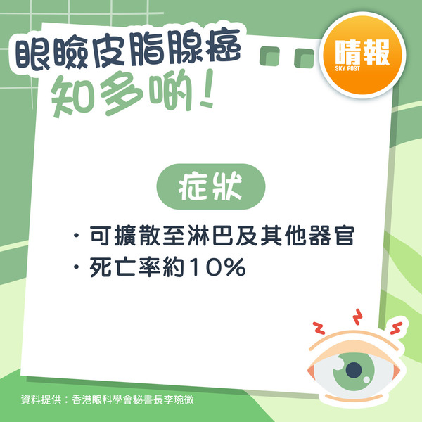 香港眼科醫學院委員袁國禮醫生指,眼瞼皮脂腺癌病徵包括慢性眼瞼結膜炎、角結膜炎、眼眶發炎等,當中上下眼瞼長硬塊亦是其中一種病徵,與一般生眼瘡相似,不少患者被誤診為生眼瘡,但眼瞼皮脂腺癌有機會擴散至淋巴,如口水腺,甚至其他器官,死亡率偏高約10%,建議若眼皮持續長有硬塊,應及早求醫。在治療方面,此癌症對放射治療不敏感,以手術切除為主,並應作冷凍切片檢確定切除邊緣已無腫瘤,以減少復發。